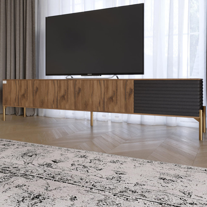 Тумба під телевізор на чорних металевих ніжках LION Грей Тумба під телевізор Грей — це стильне та практичне рішення для організації простору у вашій вітальні. Завдяки продуманій конструкції, тумба поєднує естетику сучасного дизайну з функціональністю, пропонуючи достатньо місця для зберігання мультимедійної техніки, аксесуарів і дрібниць. Її лаконічний вигляд гармонійно доповнить будь-який інтер’єр, додаючи нотку елегантності. Матеріал виготовлення Тумба виконана з ЛДСП і МДФ плівки, які забезпечують довговічність та стійкість до подряпин, вологи й температурних перепадів. Металеві ніжки додають конструкції стабільності, а також підкреслюють її сучасний стиль. Варіанти кольору ніжок тумби під телевізор Чорний Золотий Особливості Сучасний дизайн: чіткі лінії та лаконічна форма легко впишуться у будь-який інтер'єр. Функціональність: просторі відділення для зберігання дозволяють організувати кабелі, приставки та іншу техніку. Компактність: тумба оптимально підходить для встановлення телевізора, не займаючи зайвого простору. Надійність: якісні матеріали та міцна конструкція забезпечують тривалий термін служби. Розміри: Ширина: 2040 мм Глибина: 380 мм Висота: 465 мм
