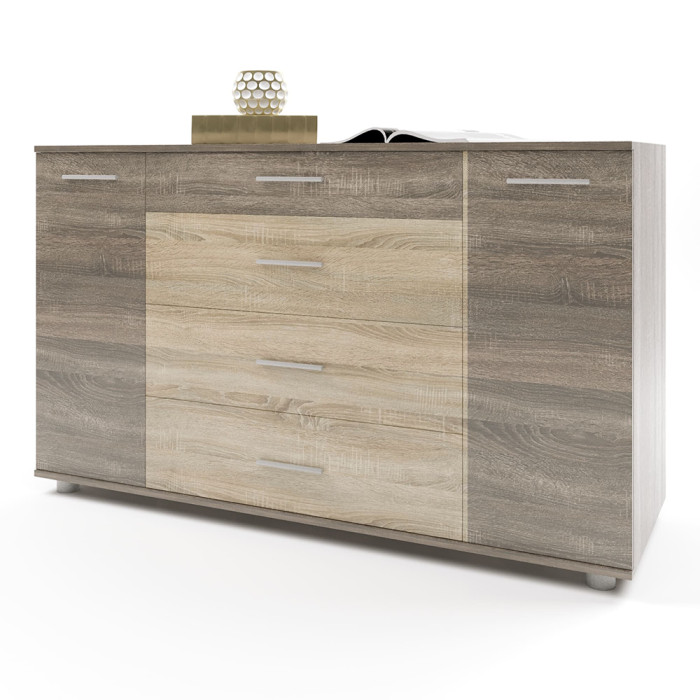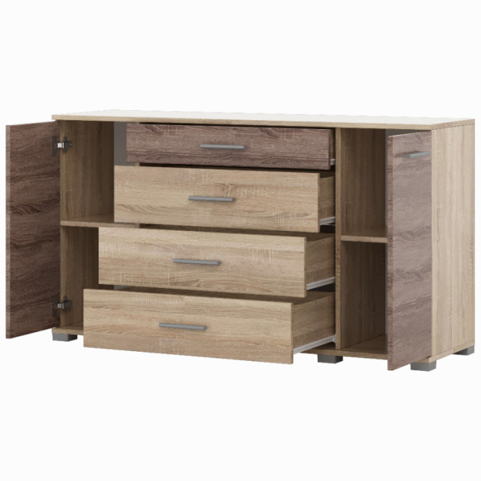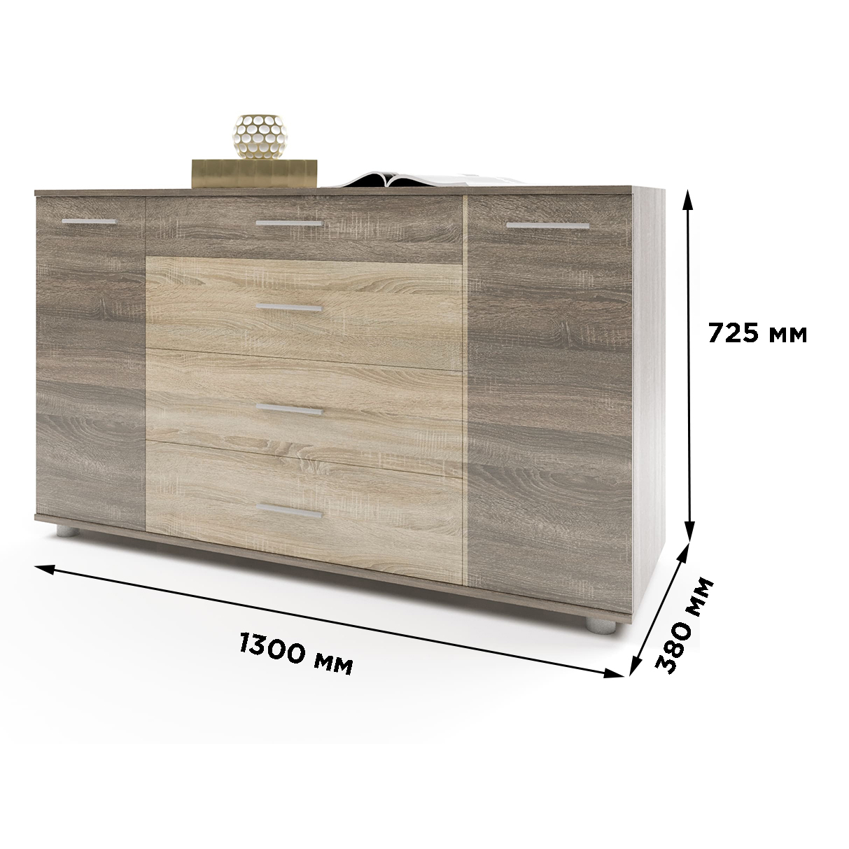 • Продуманное наполнение: Конструкция включает четыре выдвижных ящика, расположенных по центру, и две вместительные боковые тумбы, что позволяет удобно разделить вещи по типу и частоте использования.