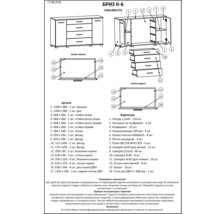 Скажу чесно, комодом задоволені як по якості так і по дизайну. Радий що обрав саме телескопічний механізм який дозволяє відкрити шухляди повністю. Запакований ідеально, прийшло все ціле не пошкоджене. Доставлено Новою Поштою. Розпаковку та збирання знімав на відео, якщо зацікавить будь ласка дивіться. До речі, збирається дуже легко. Отож для тих хто вагається, беріть не пожалкуєте. ідео для перегляду https://youtu.be/jYnt9b8I8_Q