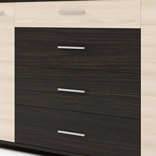 Корпус и фасады комода изготовлены из экологически чистого ЛДСП (уровень эмиссии Е1) швейцарской компании Kronospan. Высокое качество плиты гарантирует не только визуальную привлекательность мебели, но и ее безопасность, что позволяет устанавливать изделие даже в детских комнатах. Материал отличается высокой прочностью и долговечностью, сохраняя устойчивость к ежедневному использованию.