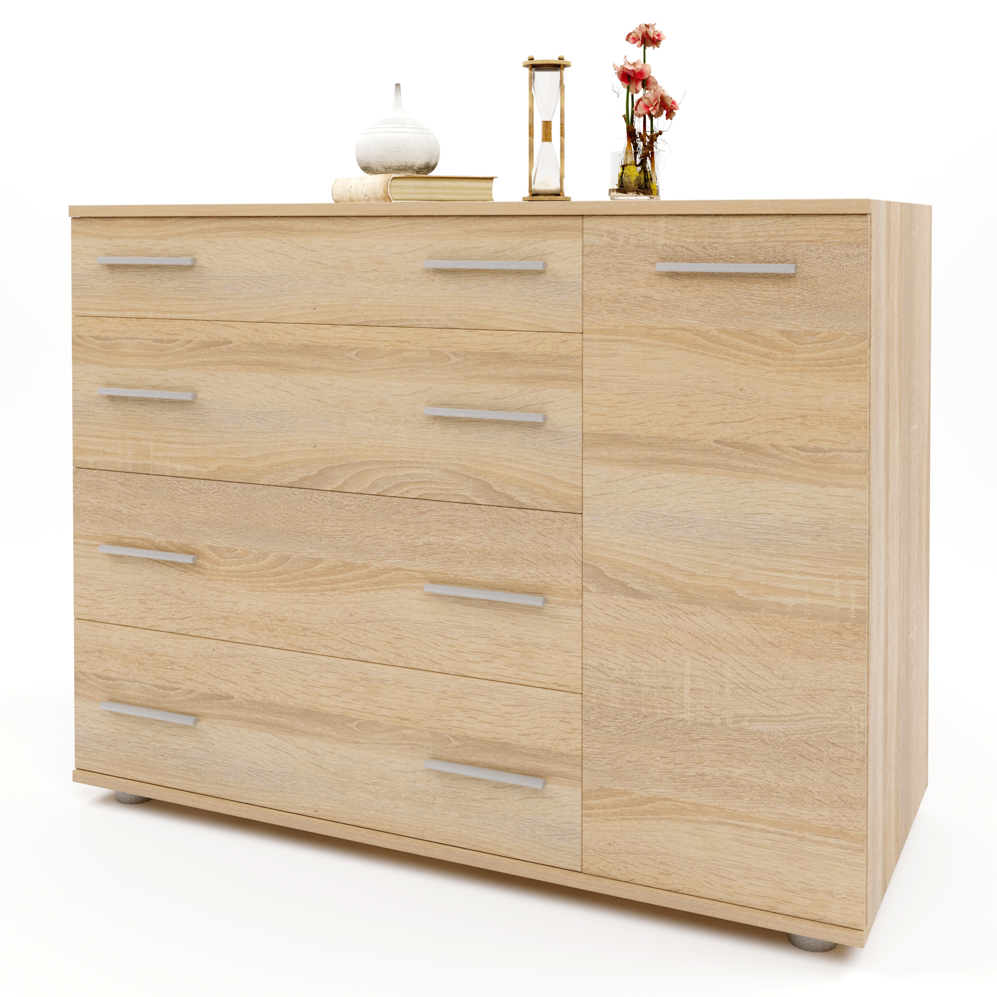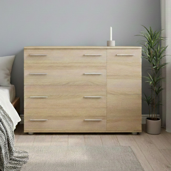 Комод для спальни Эверест К-3 — практичный и функциональный элемент корпусной мебели, сочетающий компактные габариты и продуманную систему хранения. Модель оснащена четырьмя выдвижными ящиками и отделением с распашной дверцей, что позволяет удобно хранить одежду, постельное бельё, аксессуары и другие повседневные вещи. Лаконичный дизайн делает комод универсальным решением для спальни, гостиной или детской комнаты.