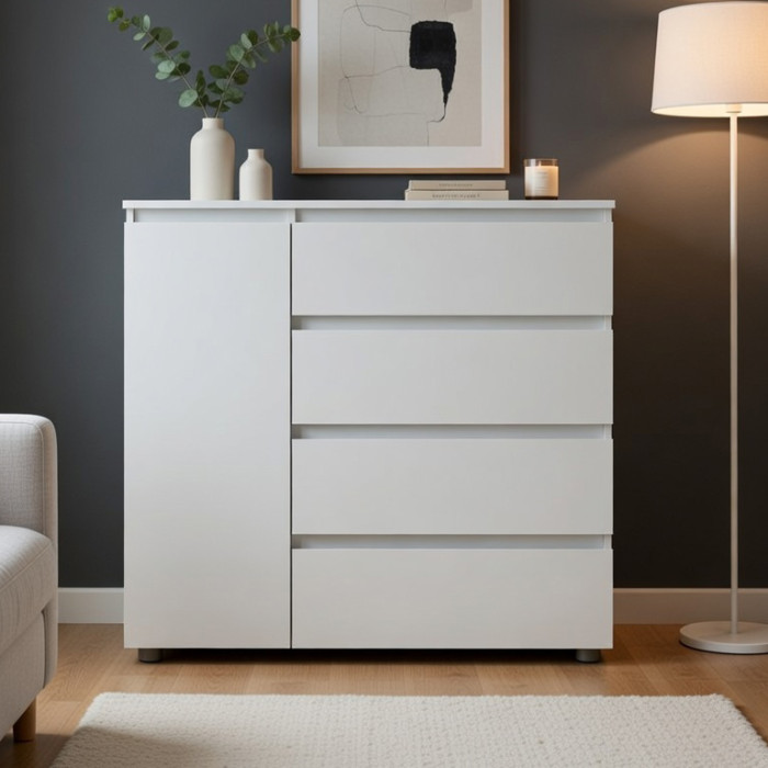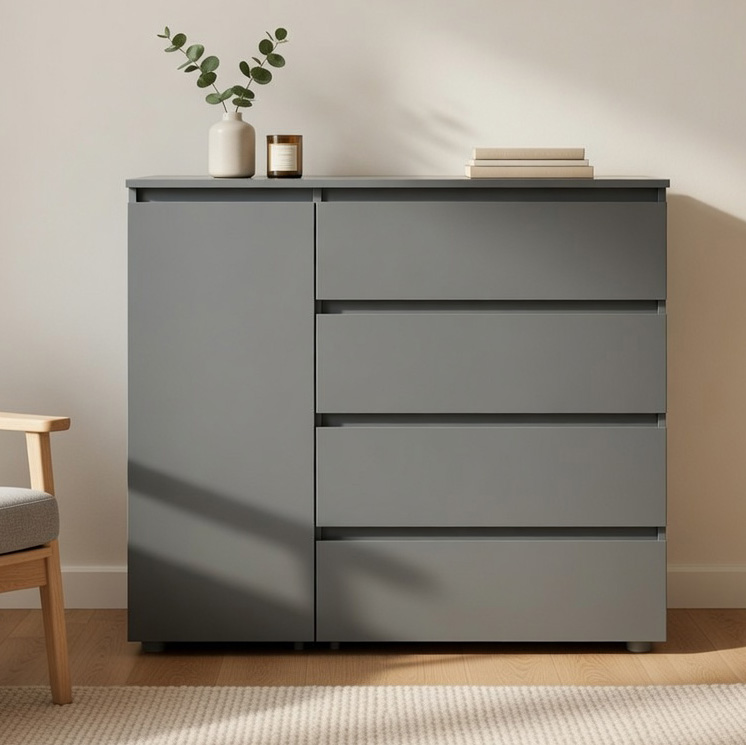 Продуманная конструкция сочетает вместительные выдвижные ящики и дополнительное закрытое отделение с полкой, что делает комод универсальным для хранения вещей разного типа.