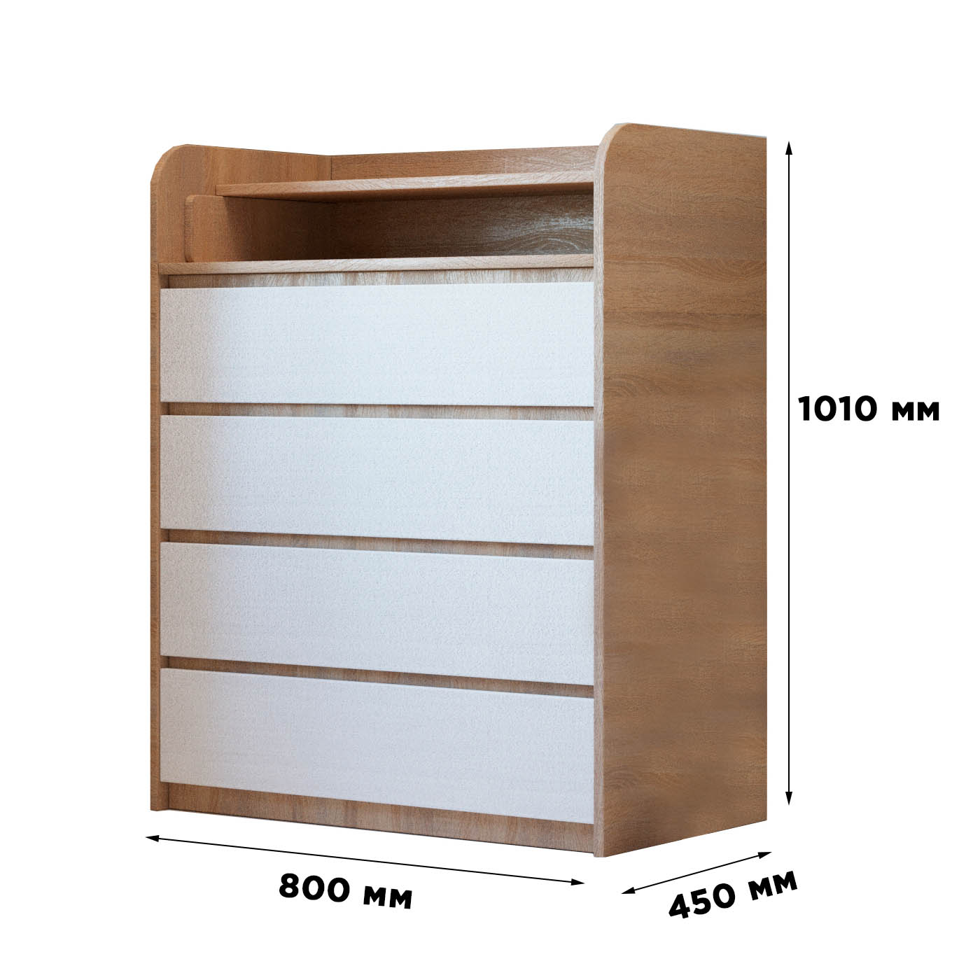Корпус и фасады комода изготовлены из экологически чистой ламинированной ДСП (уровень эмиссии Е1) швейцарской компании Kronospan. Этот материал отличается высокой прочностью, износостойкостью и устойчивостью к воздействию влаги, что важно для детской мебели. Поверхность легко очищается от загрязнений, а аккуратно обработанные кромки обеспечивают дополнительную защиту от сколов и царапин.