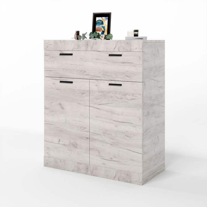 • Рациональная конструкция хранения. Комод оснащён одним выдвижным ящиком и двухдверным отделением с внутренней полкой. Такое решение позволяет удобно разделить хранение: в ящике можно размещать мелкие вещи, документы или бельё, а в нижнем отделении — более габаритные предметы.