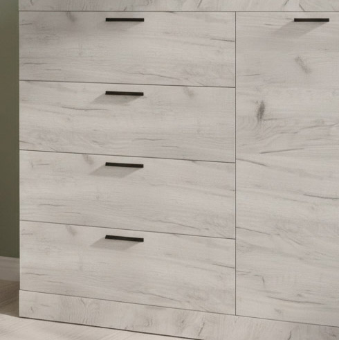 - Комбинированная система хранения: сочетание четырех ящиков и отдельного отделения с дверцей позволяет удобно распределить вещи по категориям