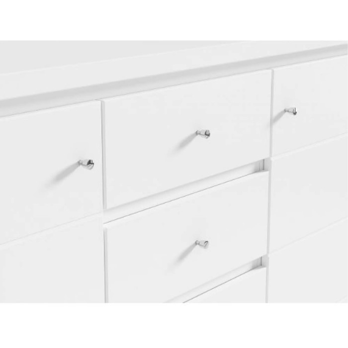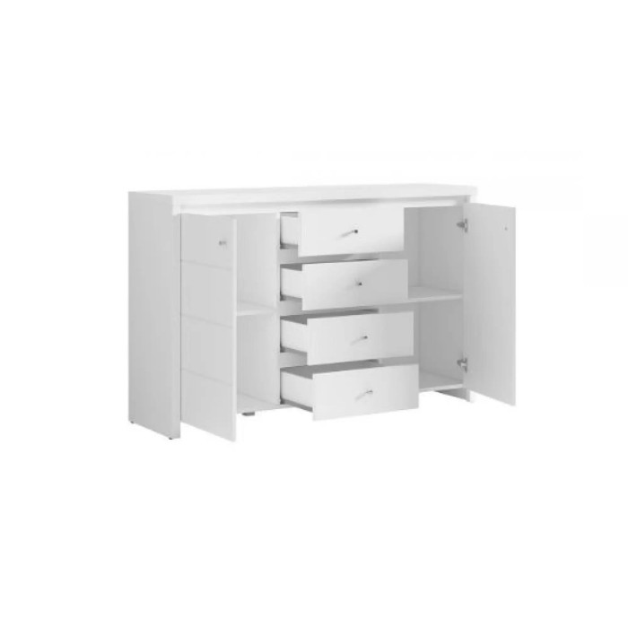 Комод оборудован четыремя вместительными выдвижными ящиками для мелких вещей и двумя широкими дверцами, за которыми можно скрыть более крупные предметы. Фурнитура выполняется по типу "ролик" с использованием фирменных петель, что обеспечивает плавное и бесшумное открывание и закрывание ящиков и дверей.