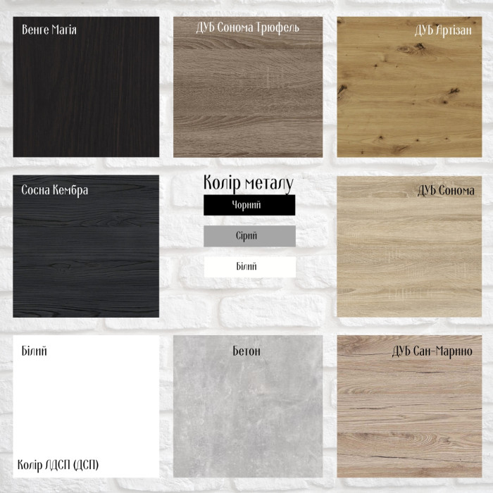 Мебель доступна в различных комбинациях цветов металлического каркаса и ламинированного ДСП. Вы можете выбрать сочетание, которое лучше всего подходит к вашему интерьеру — от классических древесных оттенков до современных контрастных вариантов. Благодаря возможности комбинировать цвета металла и ДСП, каждое изделие приобретает уникальный вид и гармонично вписывается в любой стиль оформления пространства.