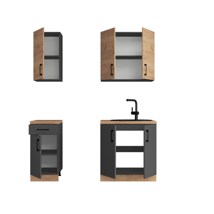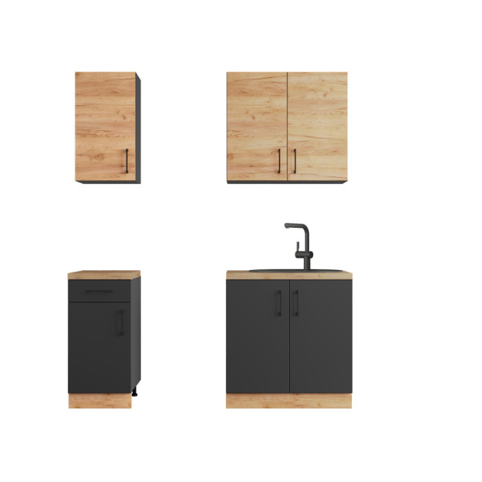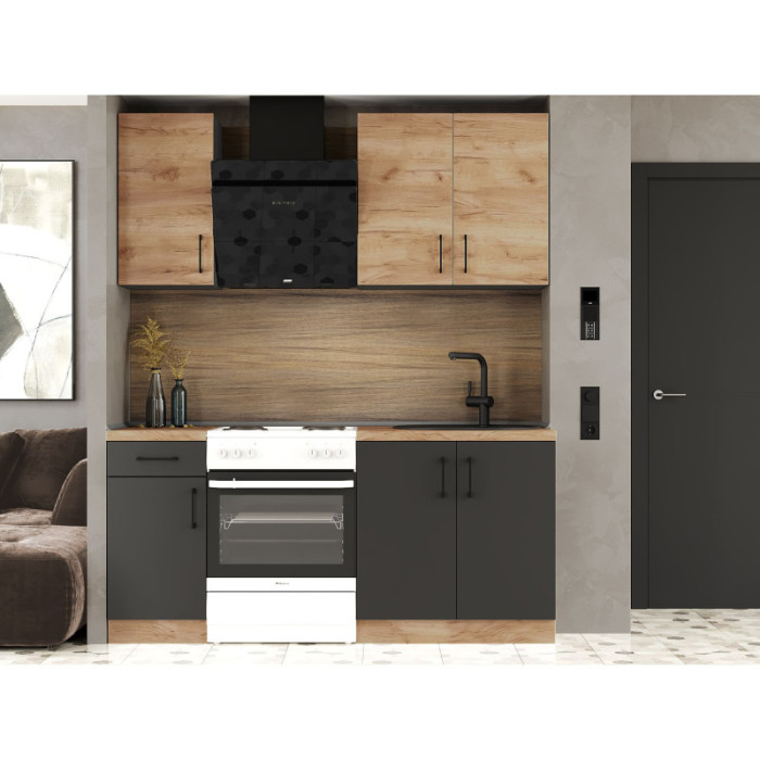 Кухня модульная Эверест Оптима набор №1 Дуб крафт золотой/Антрацит 1,8 м — это компактный и стильный гарнитур, который идеально подходит для современных кухонь. Он сочетает в себе функциональность, минималистичный дизайн и качественные материалы. Модульная конструкция позволяет легко адаптировать гарнитур под разные потребности.