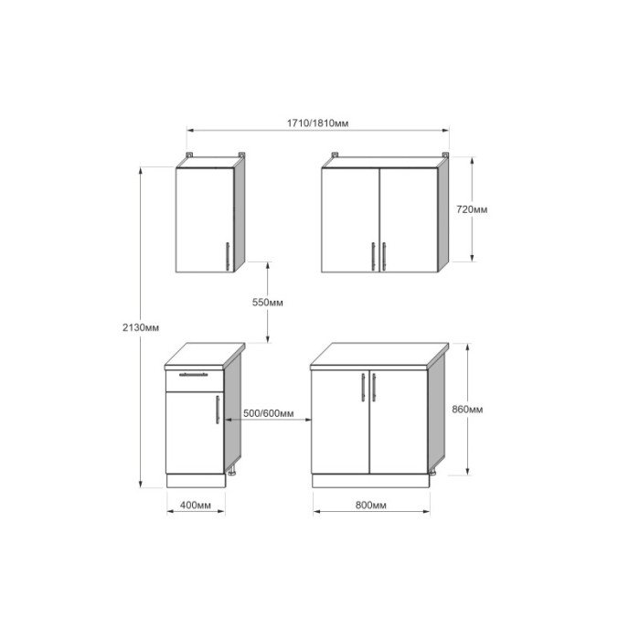 Гарнитур состоит из четырех элементов: двух верхних и двух нижних модулей. Такая комплектация позволяет оптимально организовать пространство, обеспечивая достаточно места для хранения и приготовления пищи.