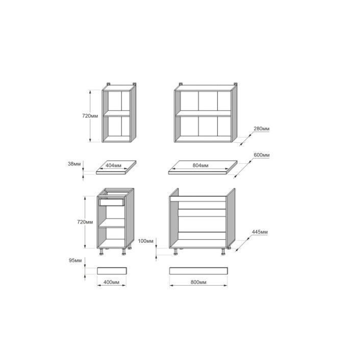 - Кухонный модуль верхний: 800х300х720 мм