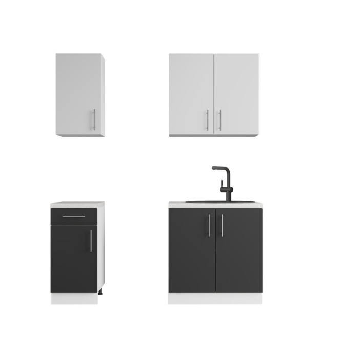 Гарнитур состоит из четырех элементов: двух верхних и двух нижних модулей. Такая комплектация позволяет оптимально организовать пространство, обеспечивая достаточно места для хранения и приготовления пищи.