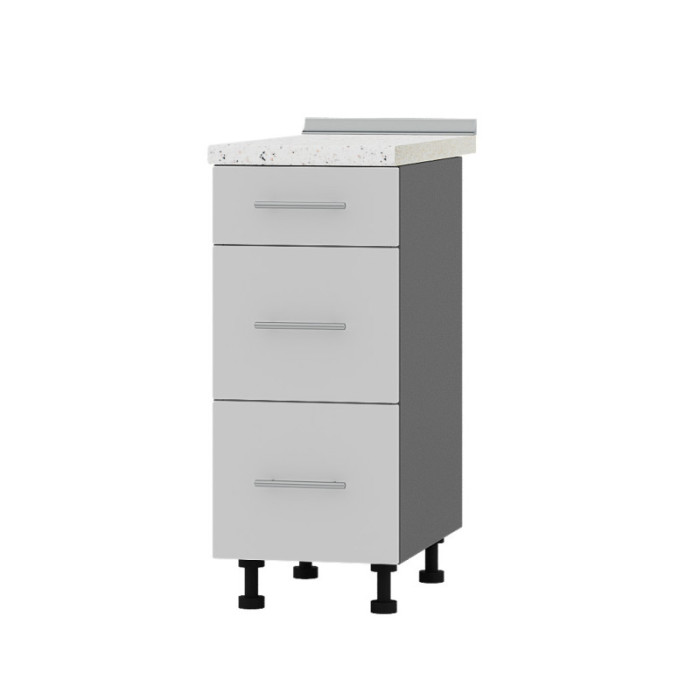 Модуль оснащен тремя выдвижными ящиками на телескопических направляющих, которые обеспечивают плавное и бесшумное открывание. Изготовленный из качественного ламинированного ДСП толщиной 16 мм с отделкой фасадов кромкой АБС (1 мм), модуль поставляется без столешницы, что позволяет выбрать ее отдельно по цвету и материалу в соответствии с дизайном вашей кухни.