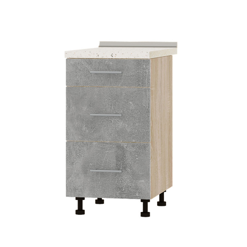 Модуль оснащен тремя выдвижными ящиками на телескопических направляющих, которые обеспечивают плавное и бесшумное открывание. Изготовленный из качественного ламинированного ДСП толщиной 16 мм с отделкой фасадов кромкой АБС (1 мм), модуль поставляется без столешницы, что позволяет выбрать ее отдельно по цвету и материалу в соответствии с дизайном вашей кухни.
