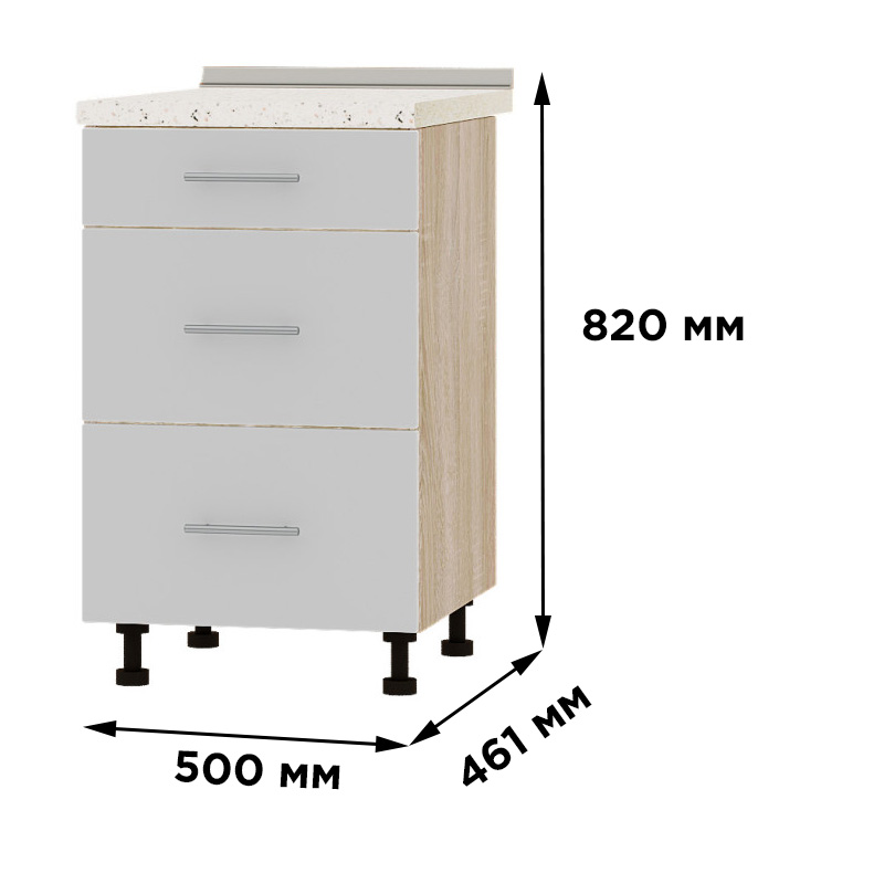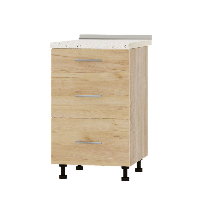 Модуль оснащен тремя выдвижными ящиками на телескопических направляющих, которые обеспечивают плавное и бесшумное открывание. Изготовленный из качественного ламинированного ДСП толщиной 16 мм с отделкой фасадов кромкой АБС (1 мм), модуль поставляется без столешницы, что позволяет выбрать ее отдельно по цвету и материалу в соответствии с дизайном вашей кухни.