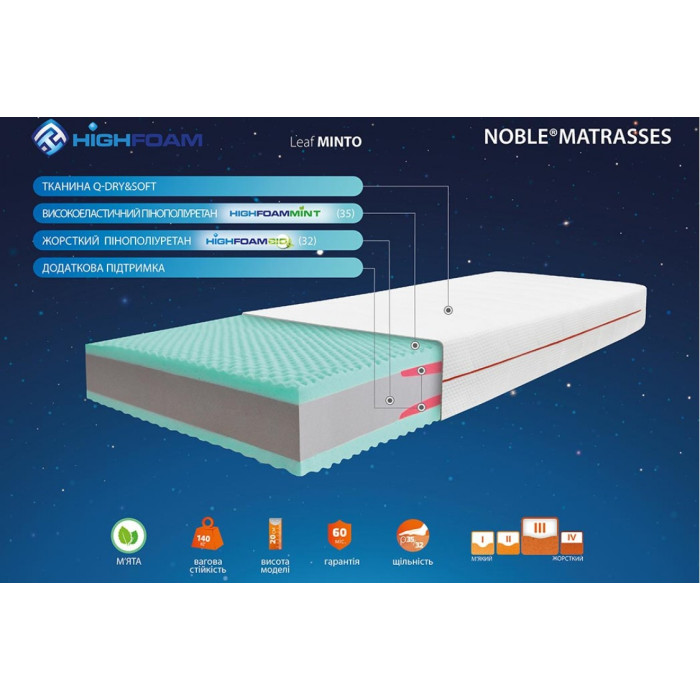 Highfoam Noble Aurum Minto является эксклюзивным зонированным матрасом с выраженными ортопедическими свойствами. Средний слой – это жесткий эластичный пенополиуретан HighfoamBio® – уникальный низкоаллергенный материал с повышенными ортопедическими свойствами. Эта комбинация делает матрас HIGHFOAM MINTO еще более крепким. Специальные вставки в среднем слое матраса оказывают максимальную поддержку позвоночника.