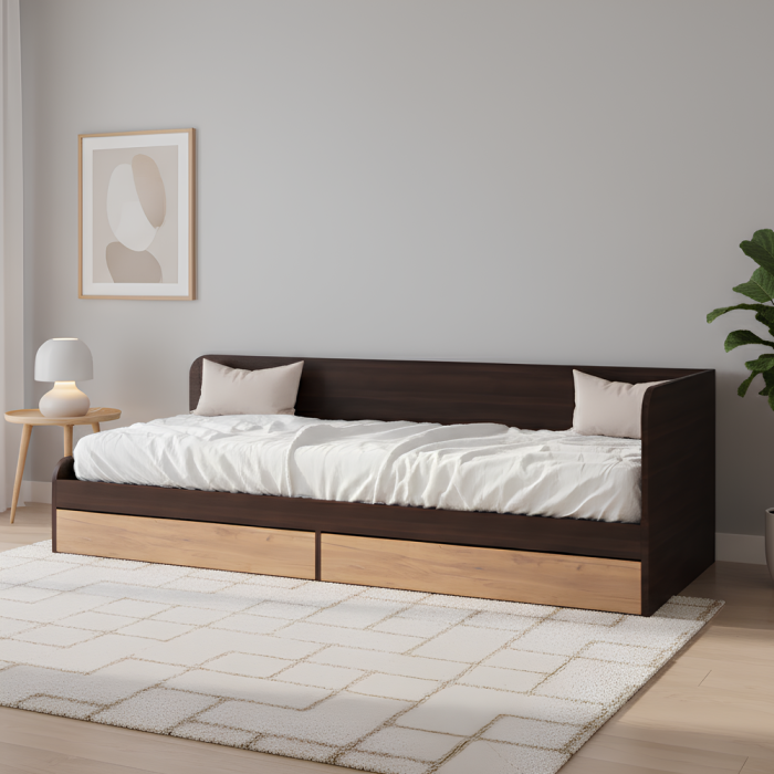 - Вместительные выдвижные ящики. Модель оснащена двумя удобными ящиками для хранения постельного белья, пледов, подушек, игрушек и других вещей.