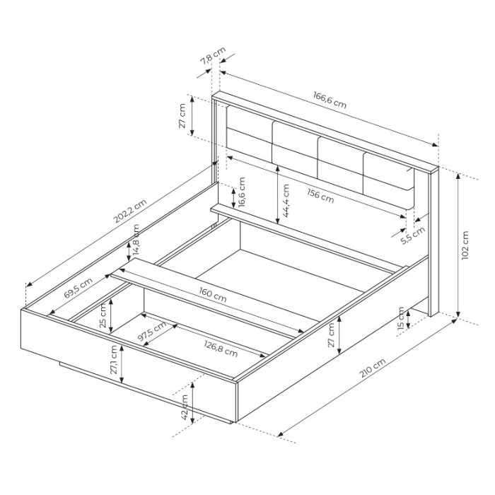 - Варианты основания под матрас: стандартное основание 160×200 см или основание с подъёмным механизмом 160×200 см для хранения постельного белья и вещей (приобретается отдельно).