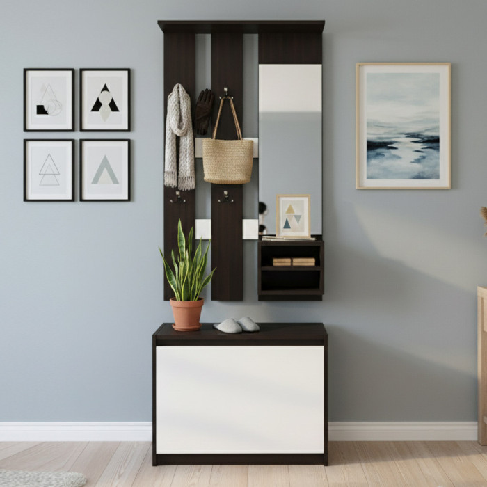 • Зеркало в конструкции: визуально расширяет пространство и делает использование прихожей более удобным.