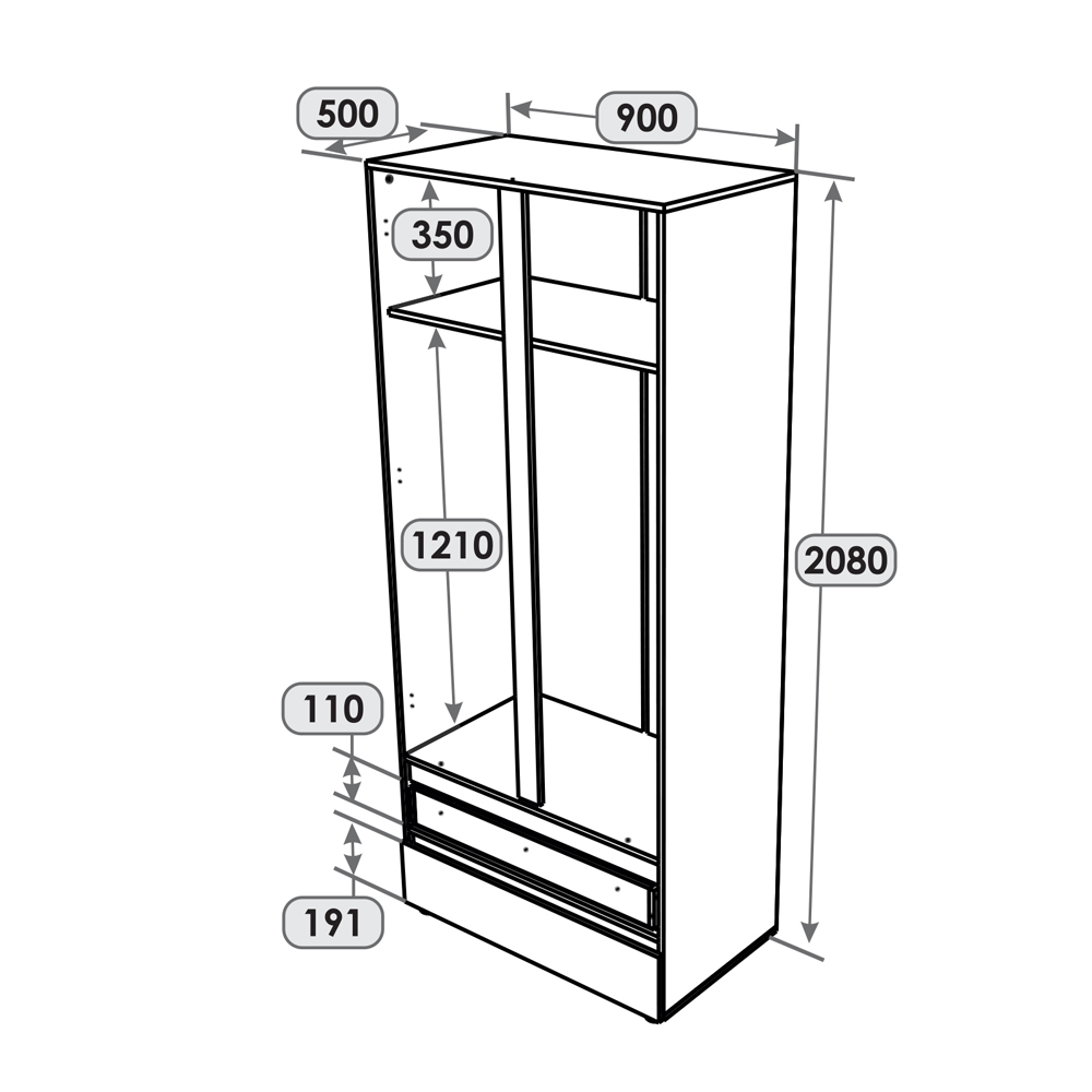 • Вместительность. Шкаф оснащен ящиками с телескопическими направляющими, полкой и просторным отделением для одежды за закрытыми дверцами, что обеспечивает комфортное использование и удобную организацию пространства.