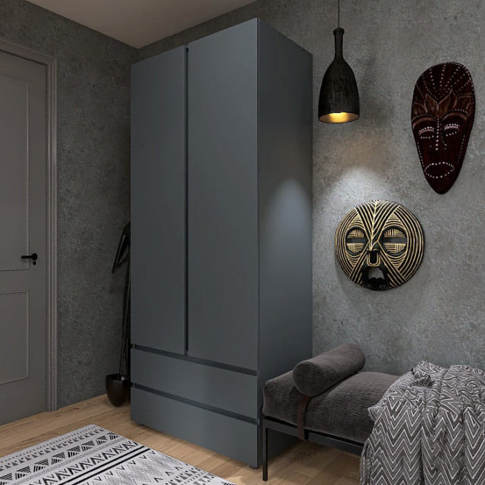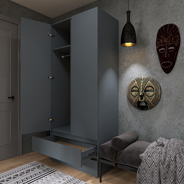 - Дополнительные выдвижные ящики: В нижней части конструкции расположены два ящика, которые идеально подходят для хранения белья, носков или мелких аксессуаров, обеспечивая быстрый доступ к ним без необходимости открывать основные двери.