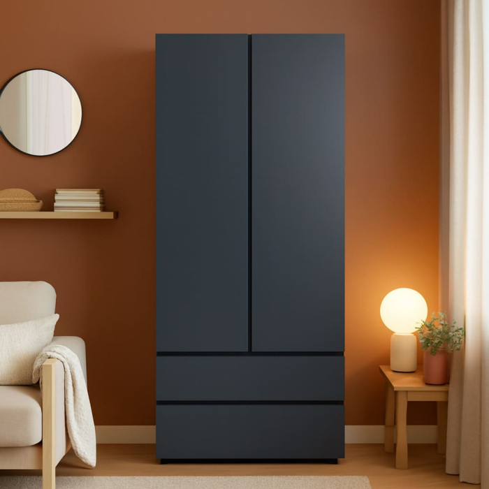 - Комбинированная система хранения: Внутреннее пространство шкафа за двумя дверцами оборудовано как штангой для вешалок, так и вместительными полками, что позволяет одновременно хранить деликатные платья и сложенный трикотаж.