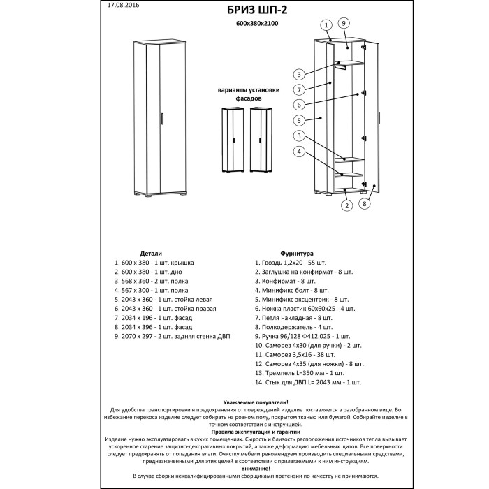Шкаф распашной Бриз ШП-2 от мебельной компании «Эверест» — стильная и эргономичная модель из коллекции Бриз, разработанная специально для современных прихожих. Компактные габариты в сочетании с продуманным внутренним наполнением делают шкаф удобным решением для хранения верхней одежды, обуви и аксессуаров.