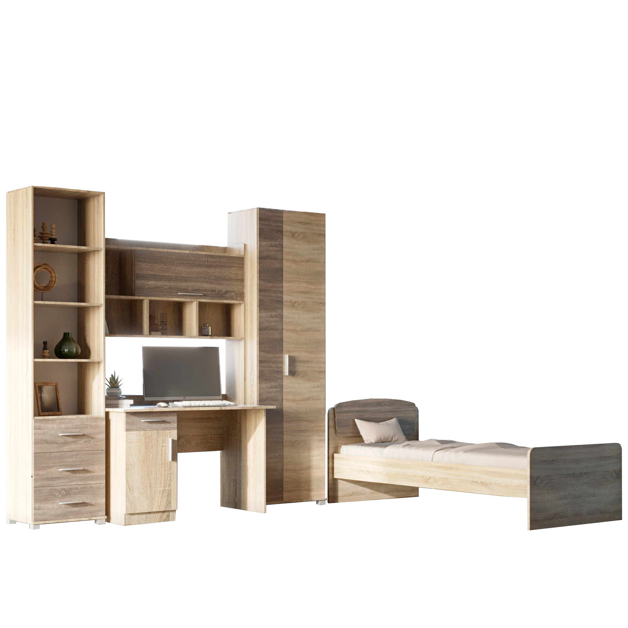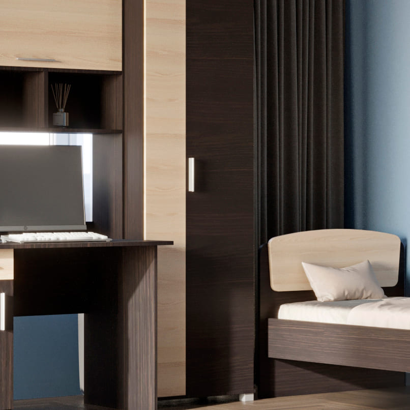• Функциональное зонирование комплекта позволяет четко разделить комнату на рабочую зону и зону отдыха, что способствует лучшей концентрации во время занятий.