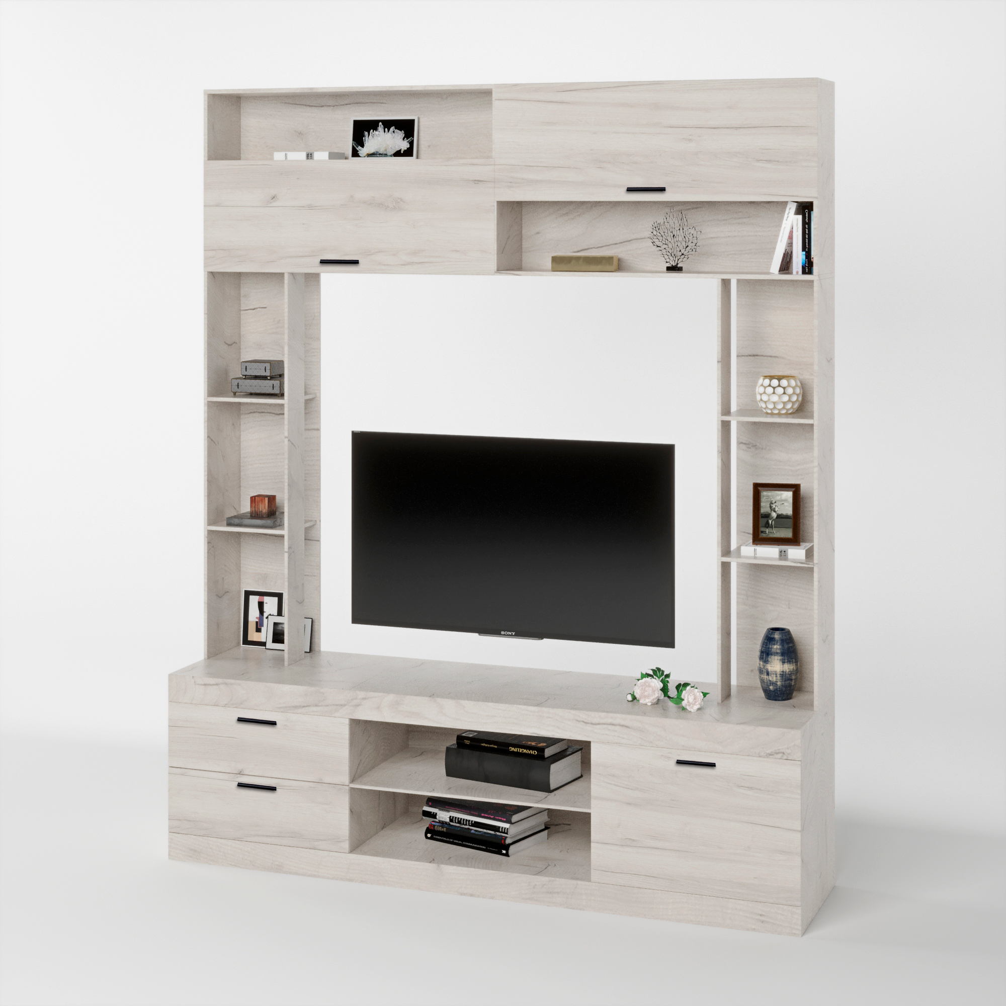 Конструкция стенки включает нишу для телевизора, три выдвижных ящика и множество открытых полок. Верхняя часть мебели дополнена двумя закрытыми отделениями с дверцами, открывающимися вверх, что делает хранение документов, аксессуаров и других предметов более удобным и аккуратным.