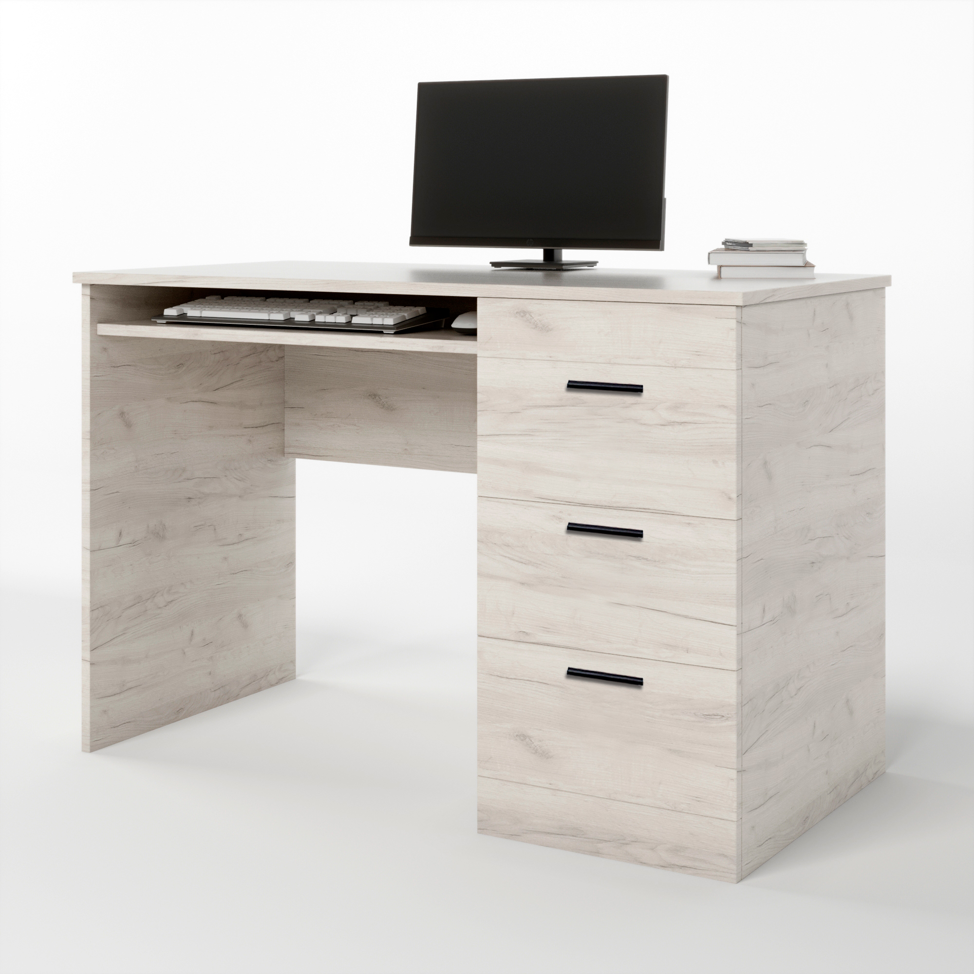 • Функциональное хранение. Стол оснащен тремя выдвижными ящиками, предназначенными для аккуратного хранения письменных принадлежностей, документов и личных вещей. В комплектацию входит удобная выдвижная полка для клавиатуры, которая позволяет рационально использовать пространство столешницы и сделать рабочую зону более эргономичной.