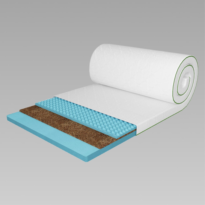 Кокосовое волокно придает изделию упругости и стабильности, а массажная пена придает мягкости и расслаблению. Пенополиуретан балансирует структуру, делая теперь удобным для ежедневного использования. Такая комбинация подходит как для спящих на спине или боку, так и для тех, кто нуждается в умеренной поддержке позвоночника без жесткого давления.
