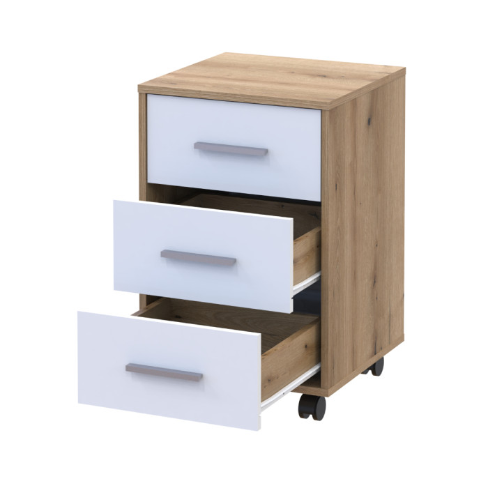 Современное сочетание дуба евок и белого цвета создаёт стильный и уютный вид. Тумба оснащена несколькими ящиками, которые обеспечивают удобное хранение и быстрый доступ к документам и канцелярским принадлежностям. Компактные размеры позволяют разместить тумбу даже в ограниченном пространстве.