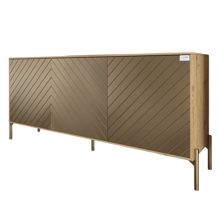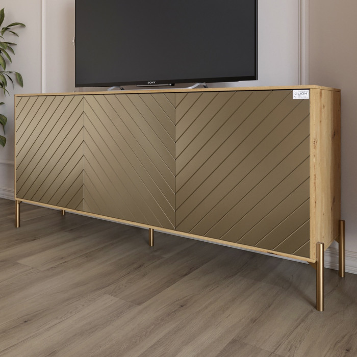 Тумба под телевизор с золотыми металлическими ножками LION Амарант 168x40x76,5 см Дуб Артизан/Перламутровый металлик (RAL-7048) 1680x400x765 (LION-043050)