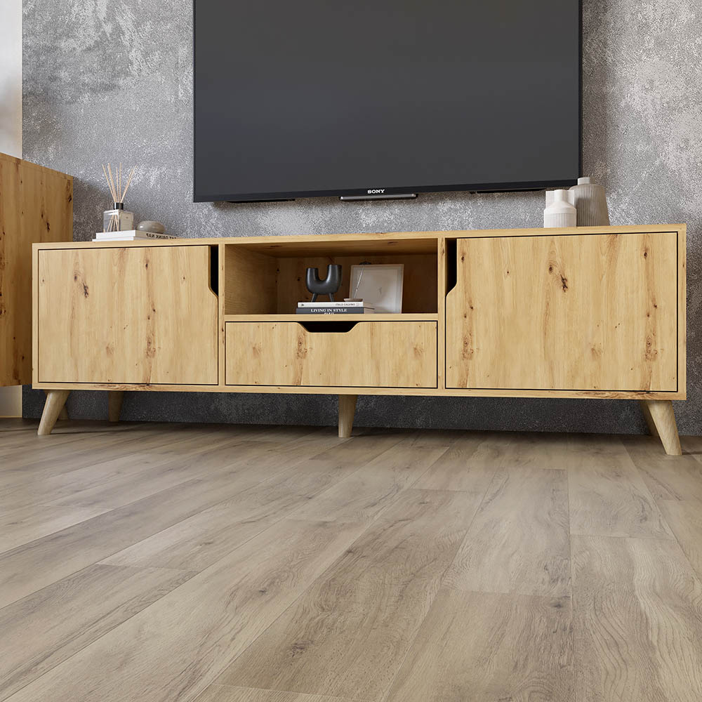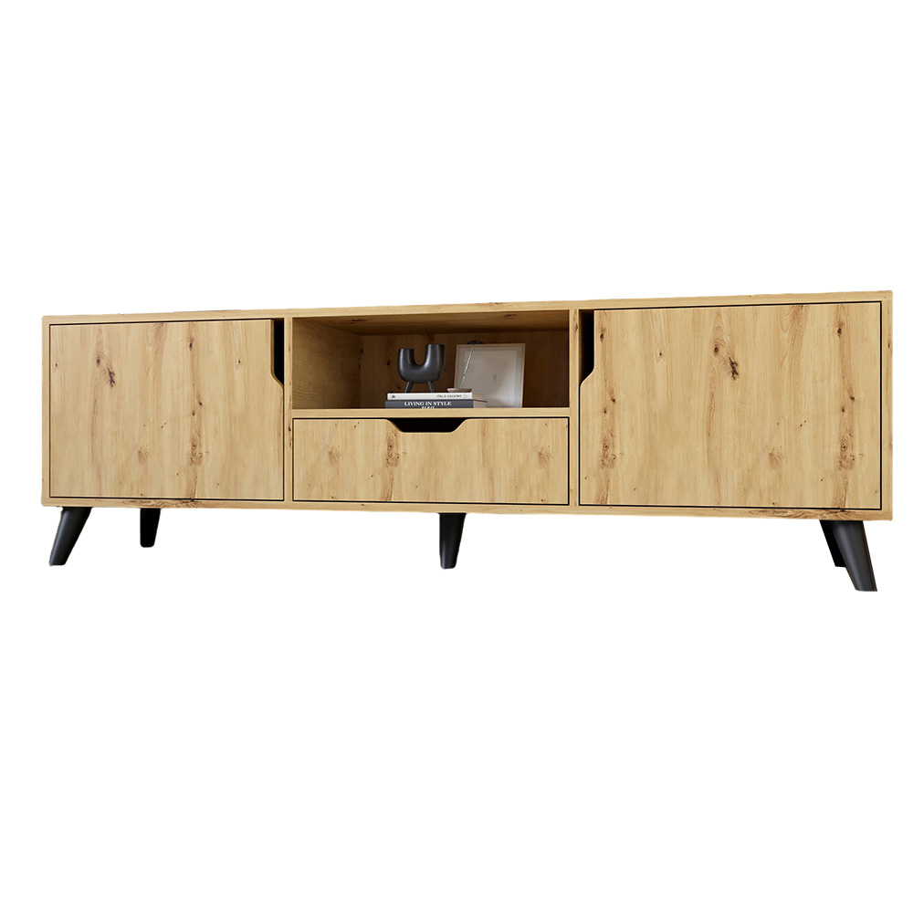 - Практичность: Тумба оснащена открытыми полками и закрытыми отделениями, которые позволяют организовать пространство для медиа-устройств, книг, игровых консолей и других аксессуаров.