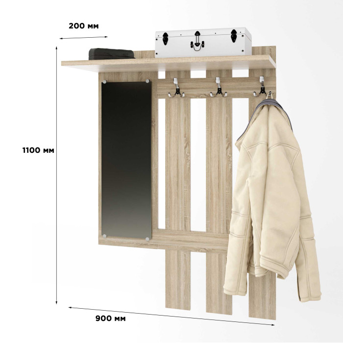 Вешалка Эверест Тандем с зеркалом — функциональный и компактный элемент мебели для прихожей, который сочетает удобство хранения верхней одежды и практичность ежедневного использования. Лаконичный современный дизайн делает модель универсальным решением для интерьеров в разных стилях. Щит-вешалка оснащен двойными крючками для одежды, а также удобной верхней полкой для размещения головных уборов, шарфов и аксессуаров. Зеркало визуально расширяет пространство и добавляет комфорта при подготовке к выходу из дома.