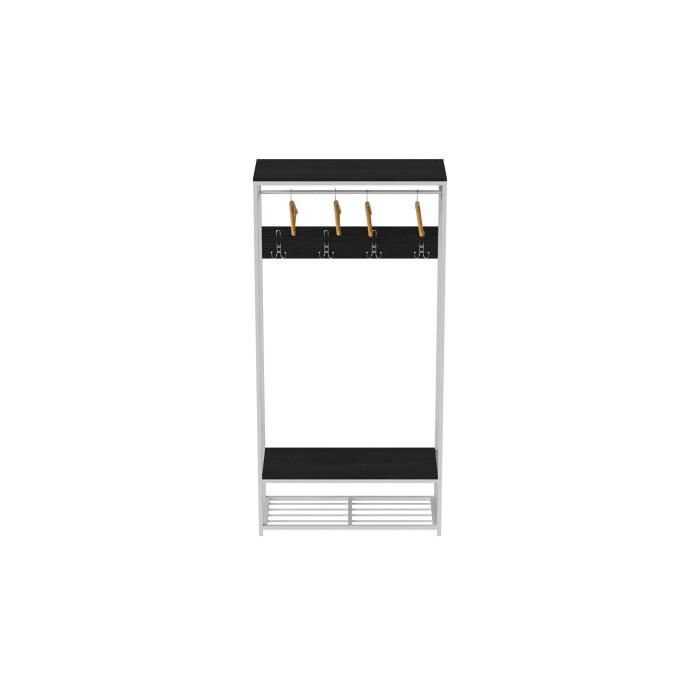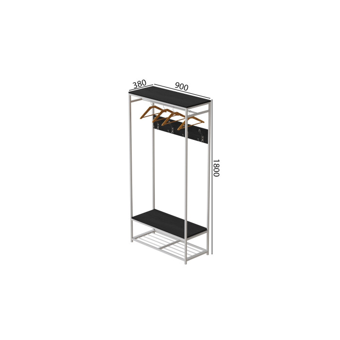 Каркас изготовлен из прочного металла и покрыт порошковой краской, что обеспечивает долговечность и стойкость к царапинам. Полки выполнены из ламинированного ДСП толщиной 16 мм, что гарантирует надежную опору для книг, декора и других предметов. Конструкция разработана таким образом, чтобы обеспечить максимальную прочность и стабильность изделия. Вешалка легко собирается благодаря системе минификсов и болтов, а необходимый инструмент входит в комплект поставки.