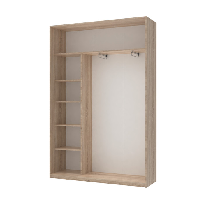 Усередині передбачено штанги для вішалок, що дозволяють зручно розміщувати одяг, а також полиці для акуратної організації речей та побутових аксесуарів. За бажанням шафа може бути доукомплектована висувними шухлядками для одягу чи зовнішнім кутовим закінченням у тон корпусу, що робить її ще практичнішою та універсальною у використанні.