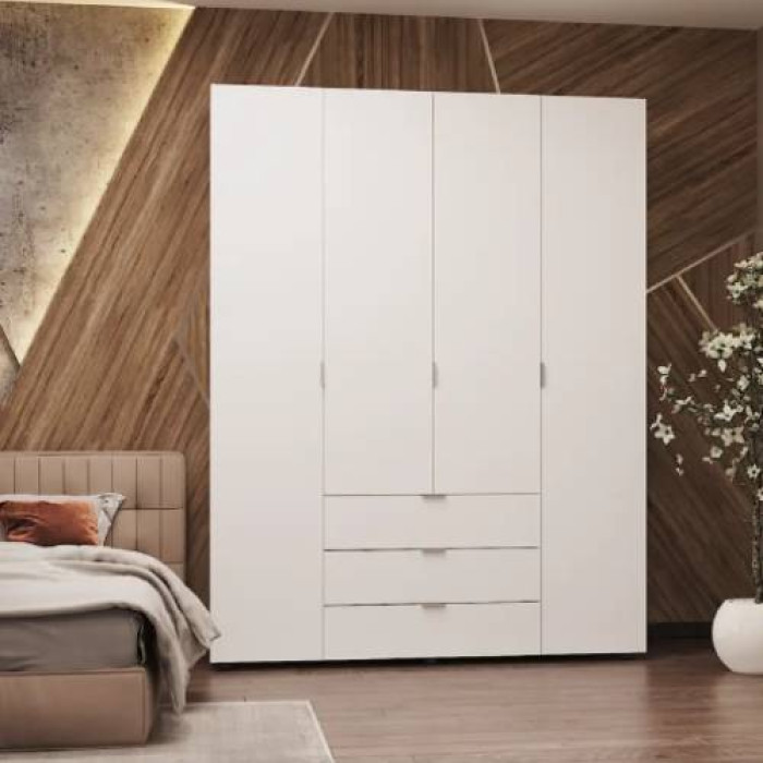 Шафа розпашна Doros Гелар створена для зручного та організованого зберігання одягу. Вона оснащена чотирма дверцятами, за якими приховано продумане внутрішнє наповнення. Просторі полиці дозволяють акуратно розмістити складені речі та текстиль. Для верхнього одягу та костюмів передбачена штанга, що забезпечує зручне зберігання без складок. Три висувні ящики чудово підходять для білизни та дрібніших предметів.