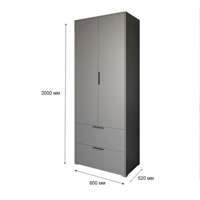 Шкаф распашной двухдверный LION Краш с ящиками Распашной двухдверный шкаф LION Краш - это стильное и практичное решение для хранения вещей в любом интерьере. Конструкция шкафа включает 6 вместительных полок, штангу для одежды и 2 выдвижных ящика, которые обеспечивают удобную организацию одежды, текстиля и других предметов. Распашные дверцы надежно защищают содержимое от пыли, а минималистичный дизайн придает современный вид, легко сочетаясь с другими элементами серии LION Краш. Шкаф отлично подойдет для спальни, гостиной или даже детской комнаты, гармонично вписываясь в их обстановку и создавая уют и порядок. Материал изготовления Шкаф изготовлен из высококачественного ЛДСП SWISS KRONO, что отличается прочностью, долговечностью и устойчивостью к механическим повреждениям, влаге и температурным перепадам. Этот материал гарантирует сохранение привлекательного вида мебели в течение многих лет. Особенности Современный дизайн: лаконичный и минималистичный вид придают шкафу эстетической легкости, позволяя гармонично вписаться в современный интерьер. Внутреннее пространство организовано максимально удобно для размещения одежды, текстиля и других вещей. Высокая функциональность: шесть полок, штанга и 2 ящика на телескопических направляющих обеспечивают достаточно места для хранения и организации, позволяя поддерживать порядок и эффективно использовать пространство в комнате. Кромка 2 мм: защищает края изделия от повреждений, придает эстетически завершенный вид и повышает долговечность изделия. Кромка изготавливается из прочных материалов, что позволяет ей выдерживать интенсивное использование и сохранять привлекательный внешний вид на протяжении многих лет. Надежность и долговечность: прочная конструкция из качественного ЛДСП обеспечивает длительный срок эксплуатации и устойчивость к износу. Размеры: Ширина: 800 мм Глубина: 520 мм Высота: 2000 мм