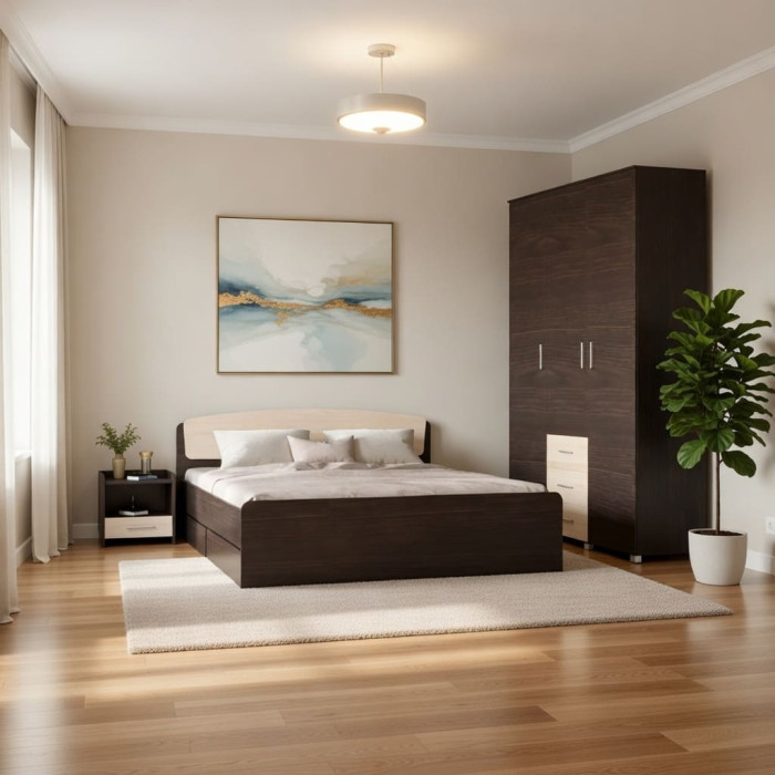 Спальний гарнітур Бриз Комплект 3 від української фабрики Еверест — це зразкове поєднання функціональності та сучасного стилю. Набір складається з окремих, самостійних елементів, які гармонійно доповнюють один одного, створюючи цілісну атмосферу затишку та спокою у вашій відпочинковій зоні. Головний акцент у цьому комплекті зроблено на максимальному використанні простору: від місткої розпашної шафи до ліжка з вбудованими нішами для зберігання. Лаконічні лінії та актуальні кольорові рішення (такі як комбінація сонома + трюфель) дозволяють гарнітуру легко адаптуватися до будь-якого сучасного інтер'єру, забезпечуючи вам комфортний сон та ідеальний порядок у речах.
