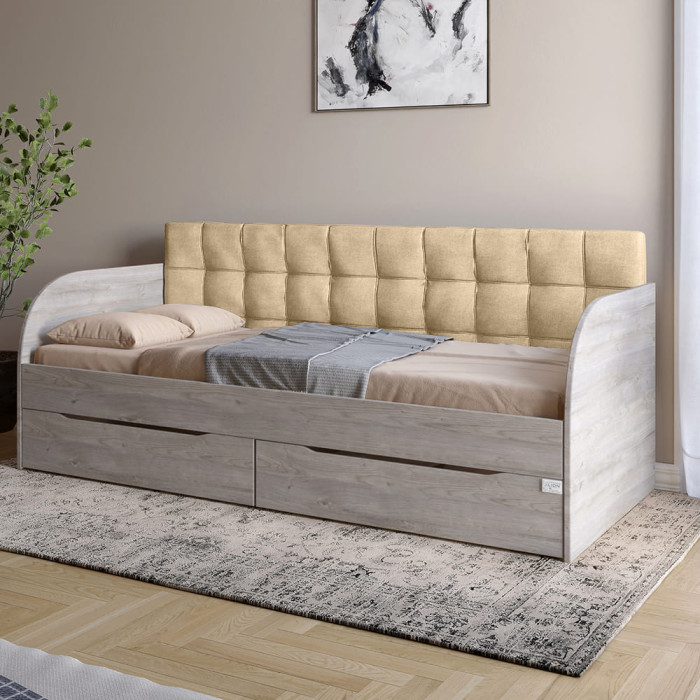 Дитяче полуторне ліжко LION Л-7 з шухлядами Ліжко L-7 це стильне і функціональне дитяче ліжко, яке ідеально підходить для створення комфортної та затишної атмосфери в дитячій кімнаті. Модель виготовлена з високоякісних, екологічно чистих матеріалів, що гарантує довговічність, безпеку і стійкість до зношування. Основою ліжка є ламелі, які забезпечують відмінну вентиляцію матраца і додаткову ортопедичну підтримку для комфортного сну. Практичні висувні шухляди додають функціональності, надаючи додаткове місце для зберігання речей. Відеоогляд: Ліжко LION Л-7 Матеріал виготовлення Ліжко виготовлене з ЛДСП SWISS KRONO - високоякісного матеріалу, що поєднує естетику з міцністю і надійністю. ЛДСП від SWISS KRONO відомий своєю стійкістю до механічних пошкоджень, вологи і високих температур, що гарантує довговічність меблів і зберігає їх естетичний вигляд на довгі роки. Ортопедичні ламелі Ліжко комплектується ламелями, що забезпечують оптимальну підтримку матраца і правильне положення тіла дитини під час сну. Ламелі сприяють вентиляції матраца, що підвищує комфорт і забезпечує здоровий відпочинок. Особливості: Висувні шухляди. Ліжко оснащене шухлядами з телескопічними направляючими, що дають змогу зберігати книжки, іграшки або постільну білизну прямо під ліжком, зберігаючи простір у дитячій кімнаті. М'яка спинка. М'яка спинка ліжка забезпечує комфорт під час сидіння, що дає змогу дитині зручно читати, дивитися телевізор або грати. Кромка 2 мм - захищає краї виробів від пошкоджень, надає їм естетично завершеного вигляду і підвищує довговічність меблів. Кромку виготовляють із міцних матеріалів, що дає змогу їй витримувати інтенсивне використання та зберігати привабливий зовнішній вигляд упродовж багатьох років. Відео-інструкція складання: Ліжко LION Л-7 Розміри: Спальне місце: 120x200 см Ширина ліжка: 2032 мм Глибина: 1240 мм Висота: 900 мм