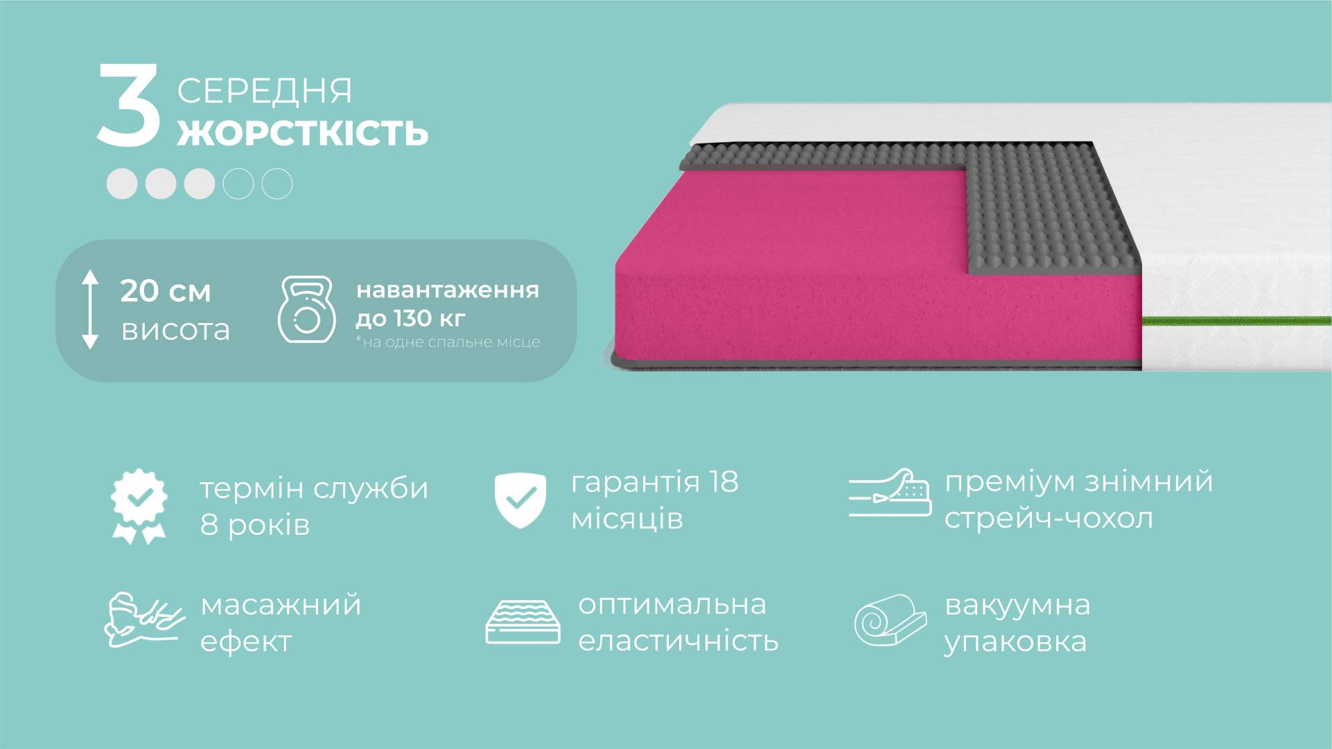 Рівень жорсткості "Середній 3" забезпечує оптимальний баланс між підтримкою і комфортом. Матрац не надто м'який, щоб провалюватися, і не надто жорсткий, щоб створювати дискомфорт. Він підходить для людей, яким важливе правильне положення хребта під час сну, але при цьому вони хочуть відчувати легку м'якість і пружність поверхні. Середня жорсткість - універсальний вибір для більшості людей з різними уподобаннями щодо комфорту.