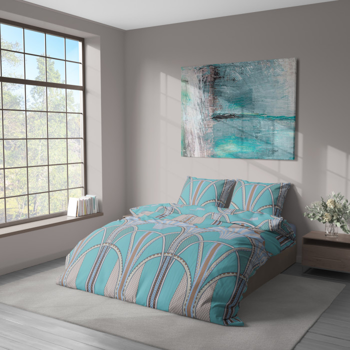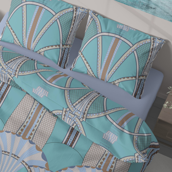 Колірна палітра комплекту представлена поєднанням ніжного блакитного і стриманого сірого відтінків, прикрашених витонченими візерунками. Такий дизайн надає білизні елегантного зовнішнього вигляду і робить її стильним елементом інтер'єру спальні. Орнаменти ненав'язливо підкреслюють текстуру тканини і додають візуальної глибини, створюючи відчуття затишку і порядку.