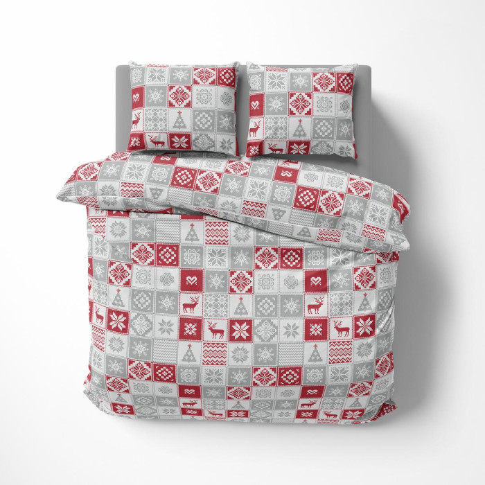 Сімейний комплект постільної білизни LeLIT Р-0173 — ідеальний вибір для затишних зимових ночей. Світло-сірий колір з яскраво-червоним новорічним принтом додає настрою та святкової атмосфери. Комплект передбачає дві окремі підковдри, що особливо зручно для пари.