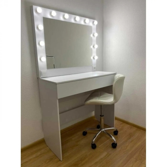 Стіл візажиста Білий / білий глянець ВМК (БРВ) Україна - це стильний і сучасний предмет меблів, який стане відмінним доповненням до вашої косметичної зони або кімнати для макіяжу. Стіл має елегантний білий колір і глянцеву поверхню, яка надає йому більш розкішний вигляд. Рама виготовлена з високоякісного ДСП/МДФ, що забезпечує міцність і довговічність конструкції.