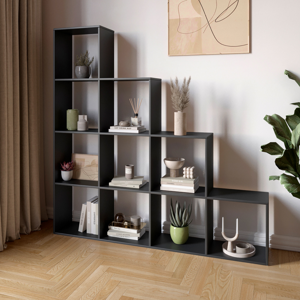 - Висота та компактність: Високий стелаж економить простір на підлозі, дозволяючи максимально використовувати вертикальний простір. Його можна розмістити в будь-якому кутку кімнати, де він не займатиме багато місця. Також цей стелаж ідеально підходить для зонування приміщень з відкритим плануванням.