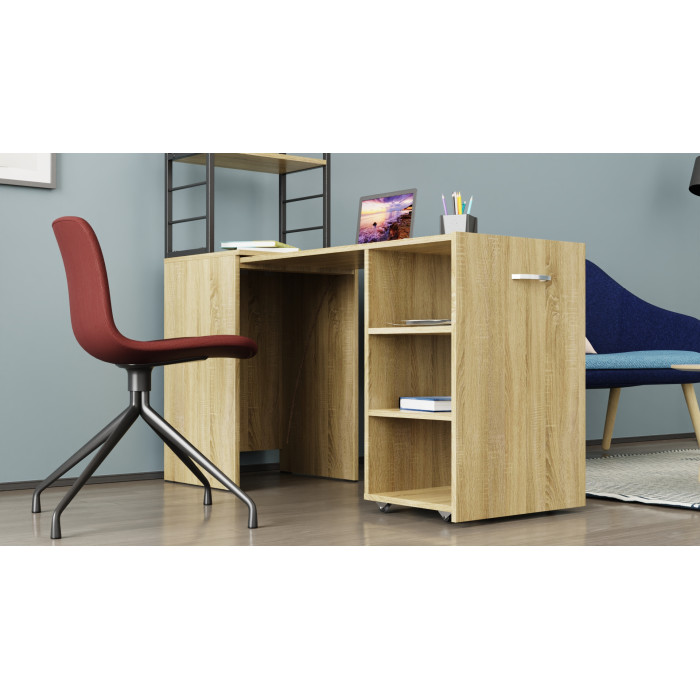 • Конструкція 2-в-1: тумба з етажеркою + повноцінний робочий стіл: максимум функціональності в одному виробі.