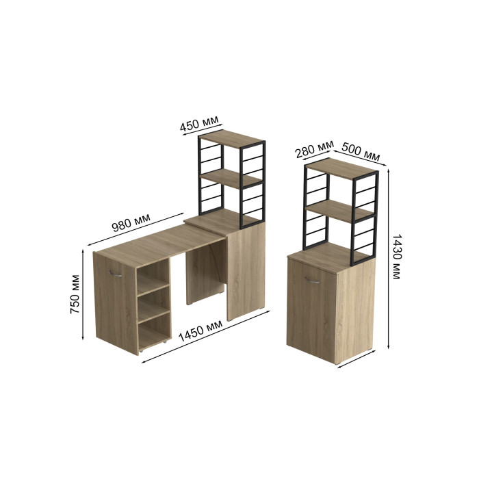 Стіл-тумба трансформер Смарт 4/1 з етажеркою Ferrum-decor 1430x1450x500 Чорний метал ДСП Дуб Сонома 16 мм (FRD-105126)