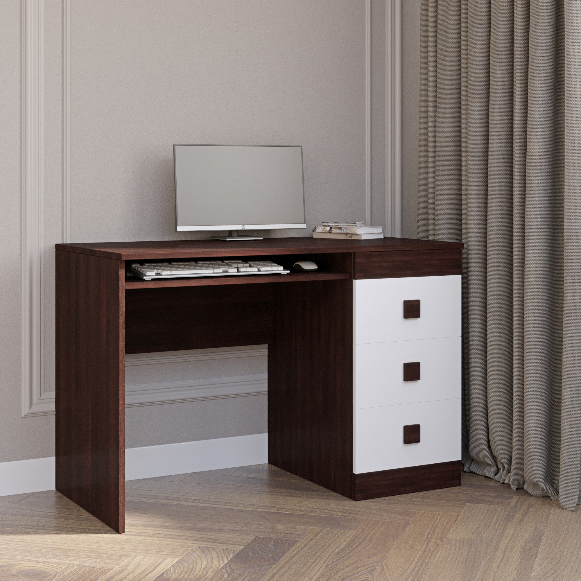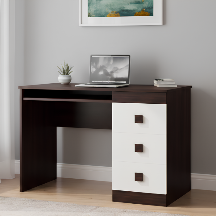 - Функціональне зберігання. Стіл оснащений трьома висувними ящиками, призначеними для акуратного зберігання письмового приладдя, документів і особистих речей. У комплектацію входить зручна висувна полиця для клавіатури, яка дозволяє раціонально використовувати простір стільниці і зробити робочу зону більш ергономічною.