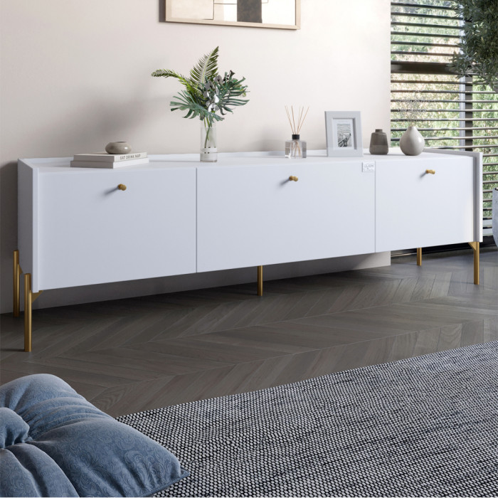 Тумба під телевізор на 3 шухляди LION Wood з золотими ніжками 180x50x40 см Німфея Альба (білий) (LION-042997)