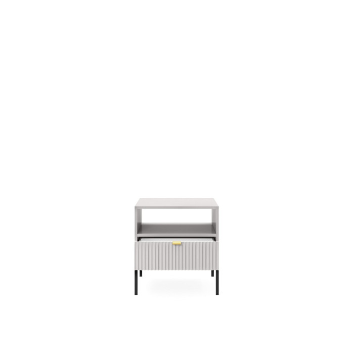 Корпус тумби виготовлений із ламінованої ДСП товщиною 16 мм, що забезпечує міцність, стійкість до зношування та приємний зовнішній вигляд, а фасад із рифленого МДФ товщиною 18 мм додає текстури та естетичного шарму. Поверхня має гладке покриття, яке створює комфортну атмосферу в спальні, а металеві ніжки висотою 20 см із порошковим покриттям захищені від корозії та подряпин. Телескопічні направляючі повного висуву дозволяють легко відкривати шухляду, забезпечуючи комфорт у повсякденному використанні.